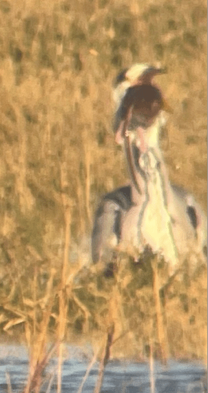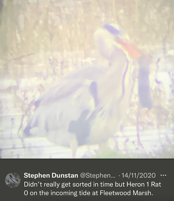 Flashback to November 2020 and a heron appeared at roughly the same state of the tide. Through my binoculars I see it struggling with extremely large prey. Checking through my scope I was somewhat surprised to see it despatching a very large rat. Unfortunately I was rather taken by surprise, and the images I got by holding my mobile phone to my telescope left a lot to be desired.