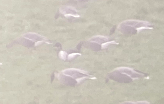 There’s something about a large flock of Pinkfeet that makes me feel there has to be a waif and stray in the group. Despite that I was just about to admit defeat and get back to work after several sweeps when I picked up an adult Pale-bellied Brent. Once I had seen it I couldn’t understand how I had missed it previously. The pictures are grotty due to distance and conditions but nevertheless you can get the impression of the small size and contrasting black and white plumage.