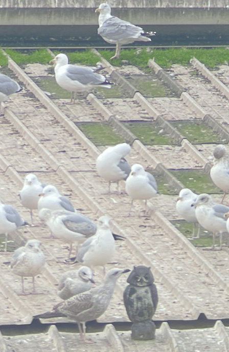 If your first thought on reading that was ‘why aren’t they dissuading gulls at a waste transfer station’ they certainly try, a bit. There is a fake owl on the roof where the gulls gather, which is meant to scare them. It doesn’t work at all, there are birds present at all times the facility is open and they don’t even give the pretend owl a wide berth. Today one young gull was actually pecking at its head rather than fleeing from the apex predator.