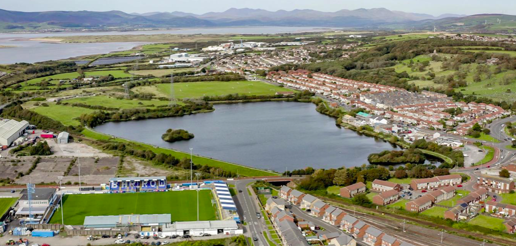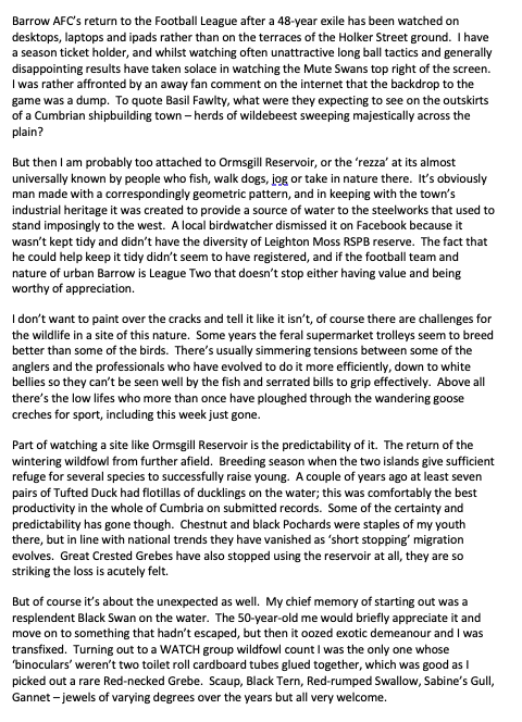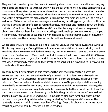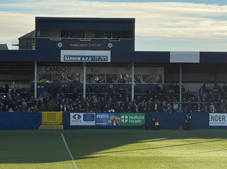 Here’s another couple of pictures I took yesterday – the reservoir from Barrow Crematorium with the Walney windfarm behind, and inside the Holker Street ground from my seat in the main stand.
