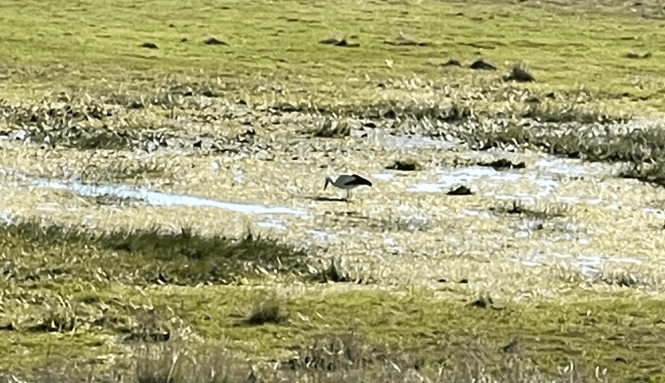 I hadn’t got very far when I saw an odd looking bird on a marshy area off Green Lane I check for Mallard and Moorhens. Raising my bins I saw it was a White Stork, as the phone shot below just about shows.