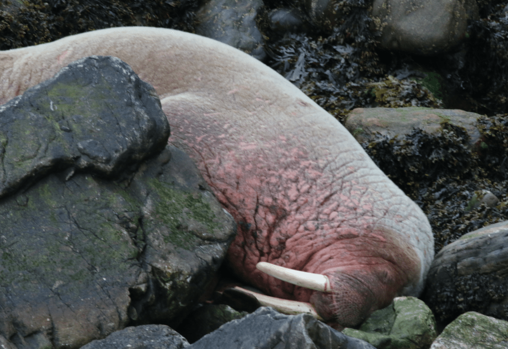 The conveyor belt of new bird arrivals had seized up as the winds changed a bit. On a quiet Sunday afternoon I stoped at Bertha Anderson’s for coffee and a chat. I left saying I had better do some birding while I was here, walked over the rise of the hill behind their house and was gobsmacked to see a walrus on the beach below me.