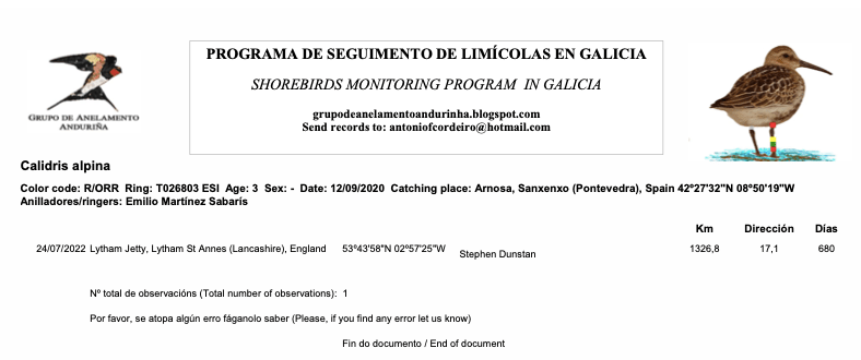 Richard de Feu kindly gave me details of the Spanish ringers who had marked the Dunlin. I was sceptical about whether the picture was good enough to clinch it to a particular individual, but Antonio from the ringing group confirmed it was and the details are below. Sometimes it doesn’t go to plan but you can still salvage something.