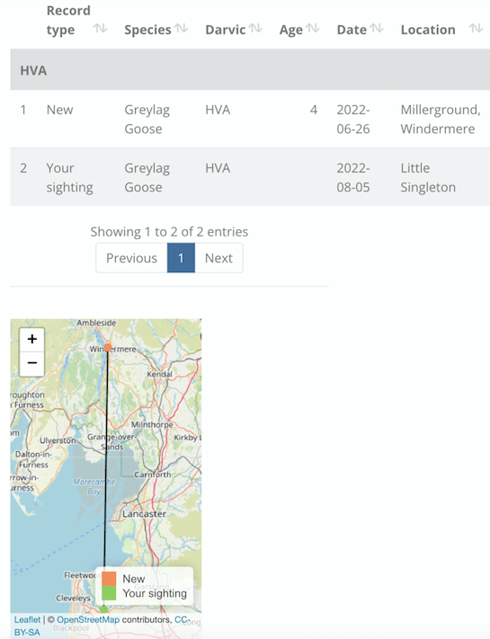 A relatively small number of new neck collars have been put on this year at Windermere. One of these birds was among the 165 birds at Little Singleton tonight – HVA. Below are a couple of pictures including the life history, which is rather brief as it was only ringed in June.
