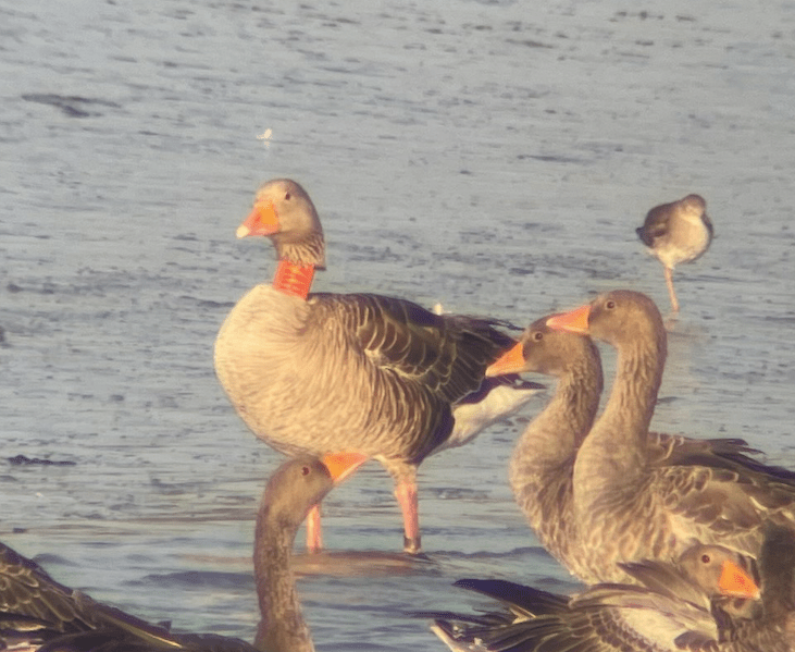 Greylags returning from moulting on Lake Windermere are regular as clockwork on the Wyre in early autumn. We know this as for many years birds with orange neck collars were among them. There hasn’t been much ringing of late and the birds dwindled away, the last goose standing is or was PZP, which outlived its partner PZS and was still around last year for a seventh season.