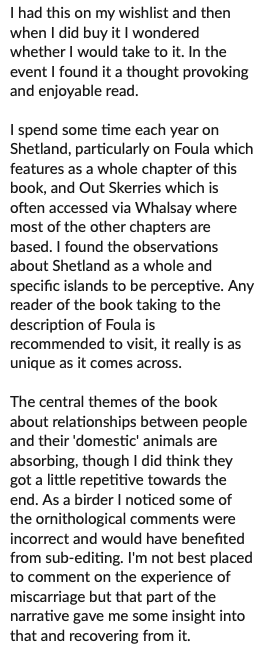 With regard to the ornithological comments, as the detail of this would sit better in this blog it included from memory a statement that terns winter in Northern Europe and several references to calls as song. But overall as someone visiting remote Shetland islands annually since 2007 I found it well written and rewarding, and it taught me a lot about Shetland ponies and the people who care for them.