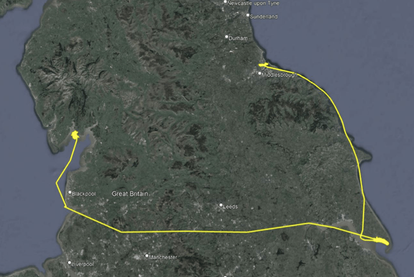 Ros kindly provided Chris and I with the photograph of ‘D4’ above, and the results of the tracking exercise as shown on the map below. After being caught on the Tees Estuary it has clearly spent some time on the Humber before crossing England overland to spend time at two premier sites for wildfowl in the North West, the Ribble Estuary and Morecambe Bay.