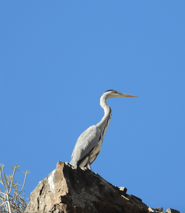 A couple of Grey Herons flew up the barranco into the hills. I hoped there might be seen unseen water they were heading for, but then I found one of them perched on a random boulder so no idea what they were doing.