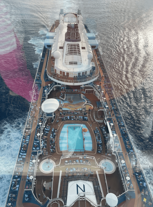 Today we went up in the North Star, which is basically a pod lifted high above the ship to give a panoramic aerial view. A couple of pictures are attached, the first one is mine including reflection of a fellow passenger. The second one is Royal Caribbeans promotional material, so can I just say what an excellent experience this is for the thrill seeking cruise passenger.