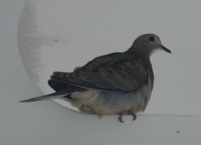 The day took an interesting turn when some rain began to fall and a few passerines began to appear on the boat. First up was a presumably new Buff-bellied Pipit, but like its predecessor it was camera shy. Then a Mourning Dove tried to land on the upper deck before settling in a handy circular gap below.