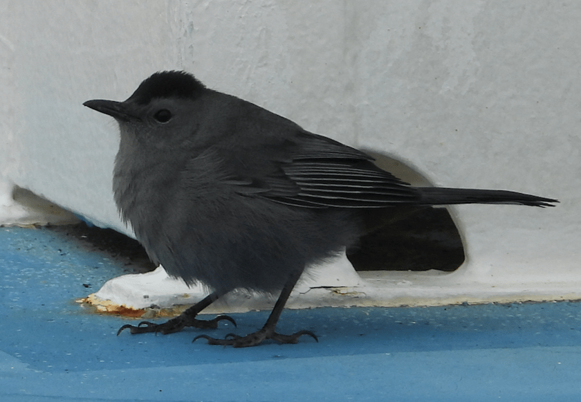 I decided to go up to the running track / sun lounger deck and see if anything was taking refuge there. I don’t know what I was expecting but I was gobsmacked when a Grey Catbird appeared on the track. Unfortunately I’d left my camera in my room because of the wet condition. When I returned with it the Catbird was thankfully still present, probably partly because the rain had emptied the exposed decks of sun worshippers.