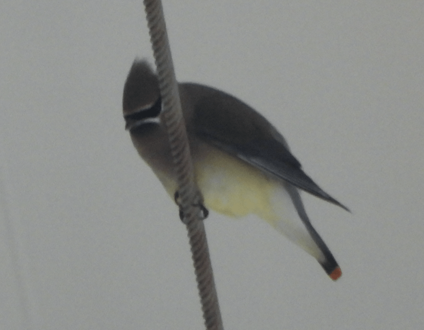 There was certainly at least one bird zipping round the decks I didn’t identify, but one which was more straightforward was this Cedar Waxwing occupying a similar niche refuge to the Mourning Dove.