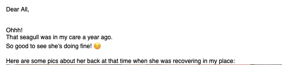 And this is where it gets really heart warming for me. Jose had blind copied in Monika who it transpired had been looking after this bird in care, where it had been ringed as it began to recover.