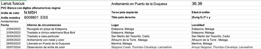 And here is the life history showing it was picked up unwell on a beach in Malaga, recuperating for a month before release then not being seen for over a year.