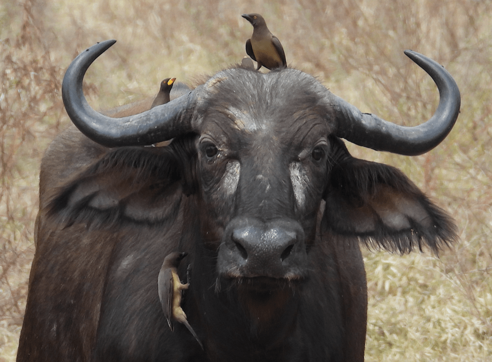 Oxpeckers on hosts – Yellow-billed (on buffalo) above and Red-billed (on giraffe) below