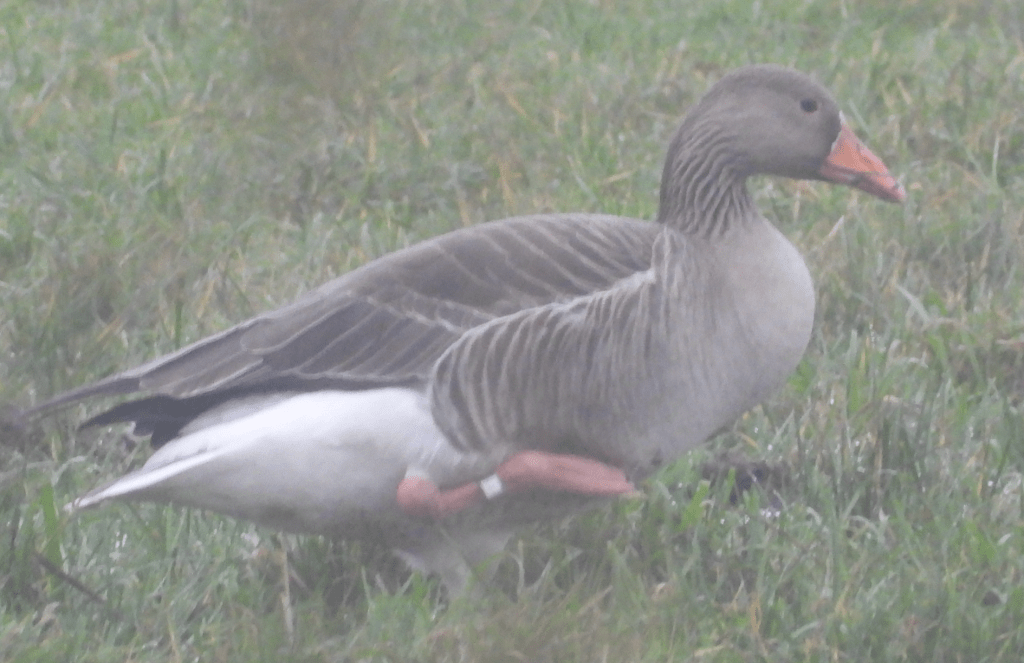 A couple of weeks ago the same flock held an unringed lone Greylag, which was very petite. It turns out presumably this individual was at the opposite end of the flock today in the mist at the far side of the field.