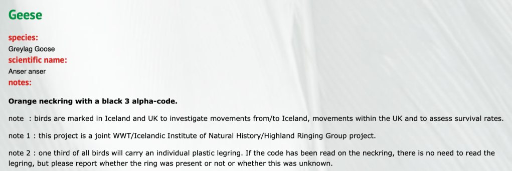 Unfortunately the code on this bird’s neck collar was never read. It would still more or less resolve the mystery if orange collars were indicative of one population or the other, but they’re not. As can be seen below both Icelandic and northern English feral populations have had orange neck collars put on birds at some point (as well as birds in Ireland and northern Scotland).