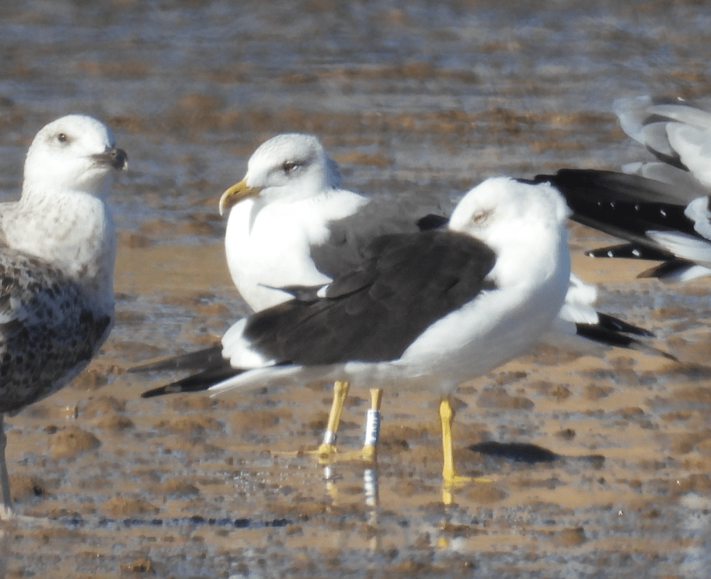 Going through the loafing Yellow-legged and Lesser Black-backed Gulls I was pleasantly surprised to see a Darvic ringed LBBG at the first time of asking. The superzoom on the camera delivered pictures that enabled me to confirm the code as V.R1F. This individual was ringed in Denmark (full details awaited). It’s well known that Lesser Black-backs often head south for the winter, but it was great to play a part in further understanding of their movements.