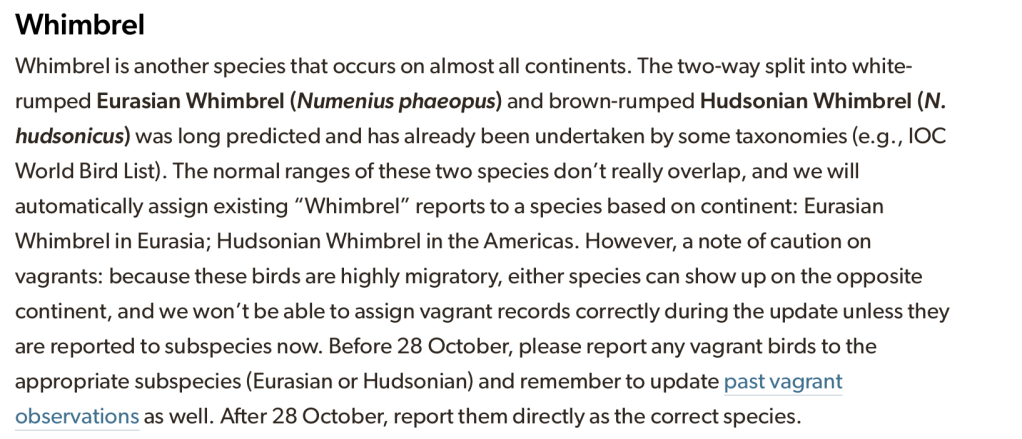 Without getting too ‘bird nerd’ about this thoughts on whether Hudsonian Whimbrel and Eurasian Whimbrel should be one or two species have yo-yoed. As it happens they’re currently yo-yoing back to them being two species as this note on e Bird explains.
