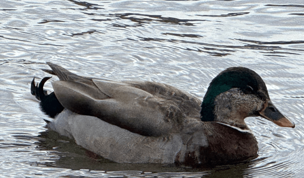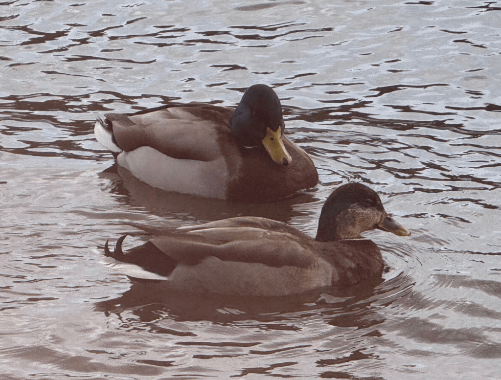After today’s drenching the weather cleared a little bit so rather than go for a coffee or beer I walked back down to the lake to look for some birds. Among a group of Mallard was an ‘intersex’ bird. This is essentially a (usually elderly) female Mallard with hormone imbalance that begins to resemble a drake. The female bill colour remains a giveaway.